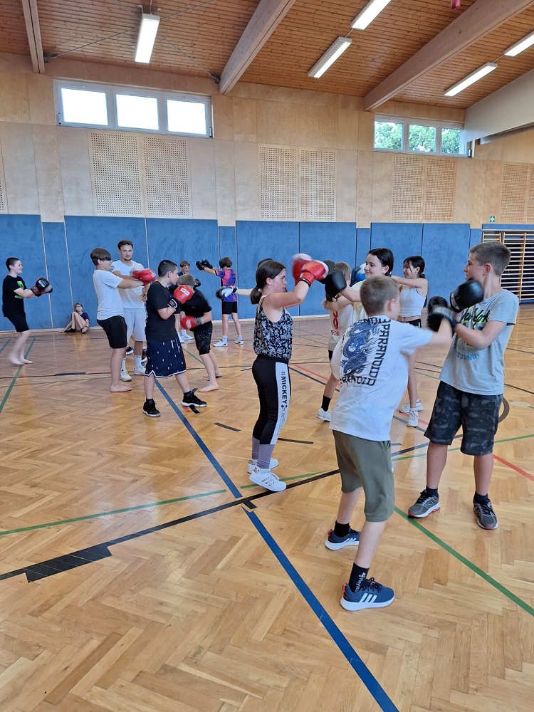 im Rahmen des „Monats des Schulsports“ besuchte der Sportclub Olymp die NMS Lanzenkirchen, um den Workshop „Kampfsport gegen Gewalt“ für die 2. Klassen anzubieten. Obmann Maximilian Ak und Trainer Marcel Rumpler boten dabei in Gesprächen und simulierten Gewaltsituationen den Kindern mögliche Konfliktlösungen an. Natürlich wurde auch fleißig trainiert, geboxt und geschwitzt. Spannend waren besonders die Geschichten von Marcel Rumpler, der neunfacher Österreichischer Staatsmeister im Boxen und Sieger zahlreicher Internationaler Boxturniere ist.