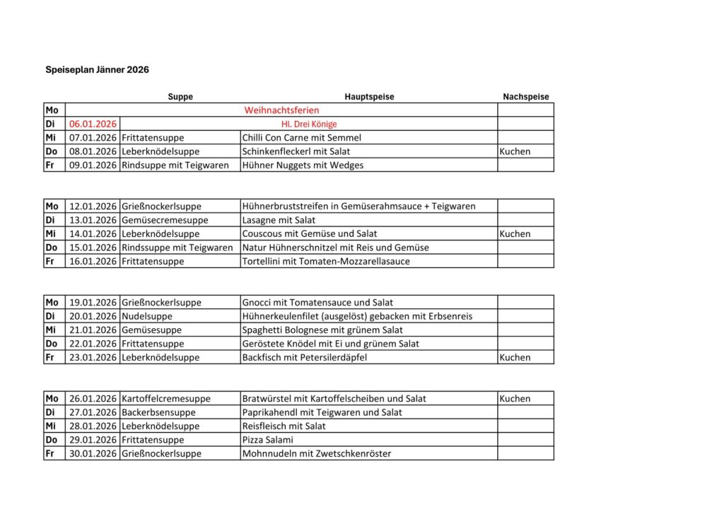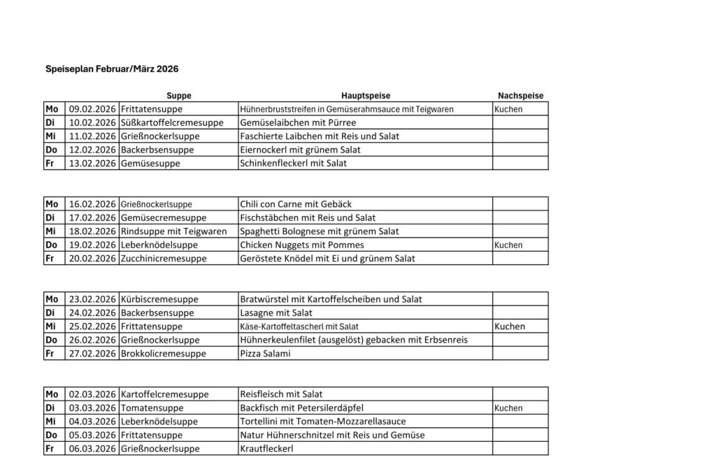 Menüpläne – Jänner, Februar, März 2026