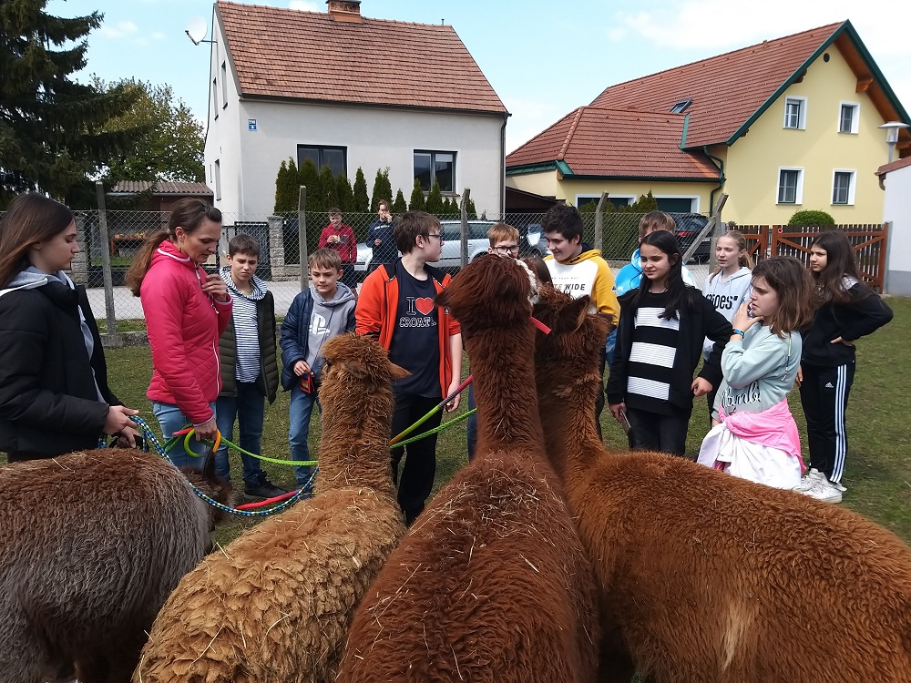 Auch beim zweiten Ausflug mit den vier Lanzenkirchnern Alpaka-Burschen Cäsar, Tim, Zodiac und Palermo der Familie Puchegger waren die Kinder begeistert. Dieses Mal waren die SPFI-Kinder der 1b- und 3a-Klasse an der Reihe, verantwortungsvoll die Tiere auszuführen. Nach den zögerlichen ersten Kontakten, hatten sich Tier und Mensch aber schnell aneinander gewöhnt.