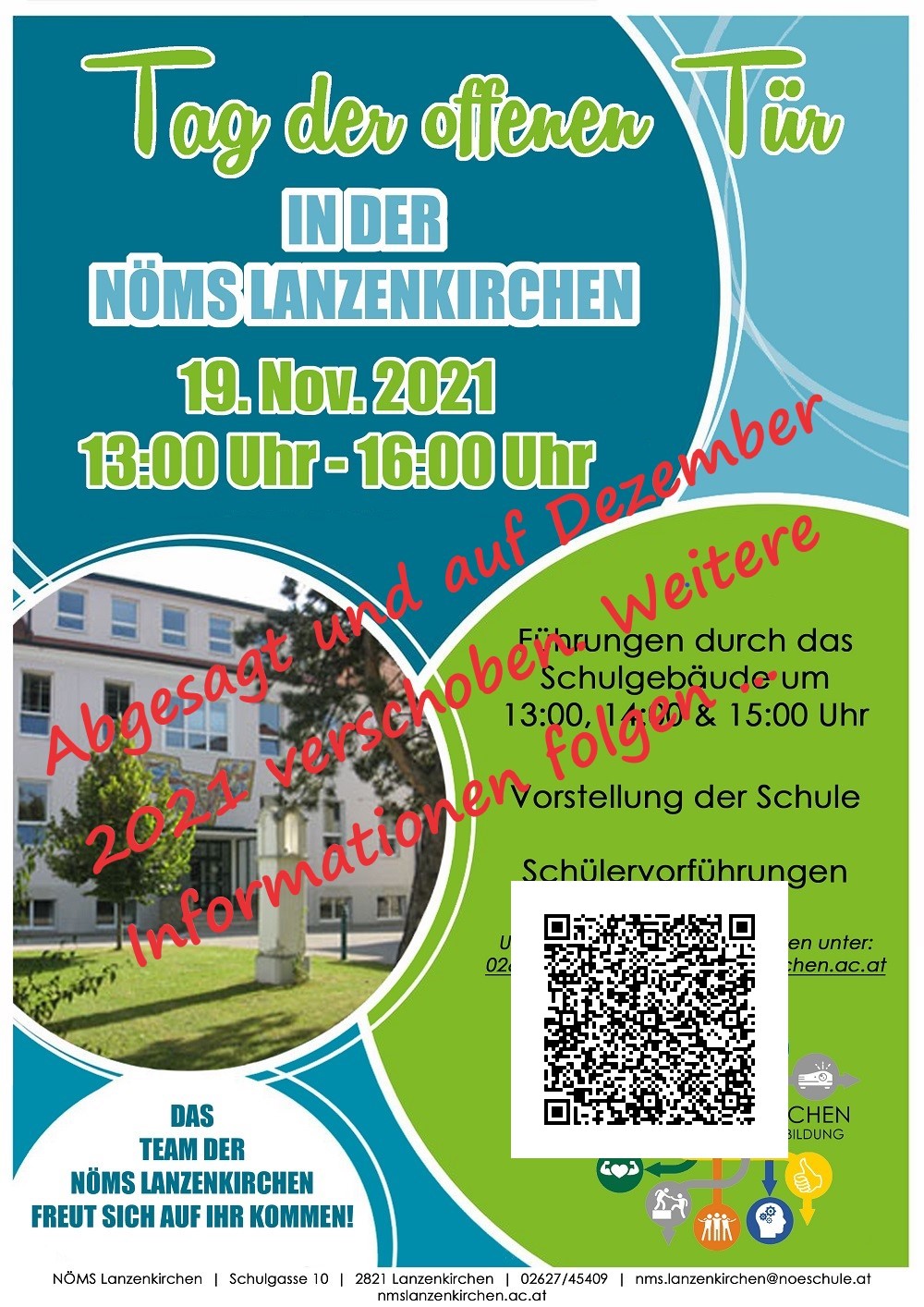 Leider muss aufgrund der aktuellen Covid19-Situation der“ Tag der offenen Tür“ abgesagt und auf Dezember 2021 verschoben werden. Als kurzfristiger Ersatz findet am 16. November 2021 um 17.30 Uhr eine Online-Informationsveranstaltung mit Schulleiter Martin Friedl statt. Im Anhang der Link zu diesem Webinar in MS Teams.