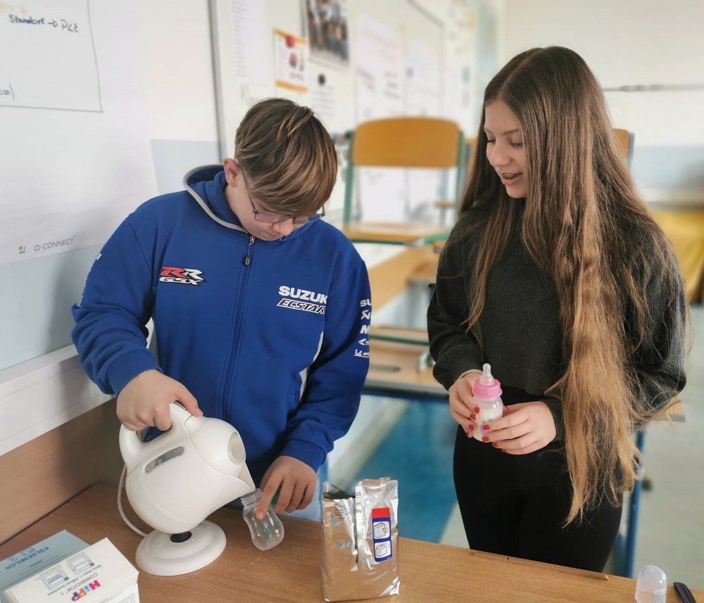 Spätestens wenn man eigene Kinder hat weiß man, dass die Zubereitung von Babynahrung eine eigene Wissenschaft sein kann. Aus diesem Grund widmete sich die Babyfit-Gruppe der NMS Lanzenkirchen mit FL Eveline Schadl diesem Thema. Die Eigenschaften und Rezepte von Babygrundnahrung wurden besprochen und das Zubereiten des berühmten „Flascherls“ geübt. Highlight war dann das Füttern mit dem Babybrei.