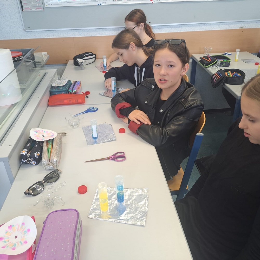 CHEMfluenzer sind junge Mitarbeiter der Chemieindustrie, die Schulen besuchen und ihre Begeisterung mit dem Thema und Beruf an die Schüler und Schülerinnen weitergeben. Nach einer kurzen Präsentation, in der vor allem die Bedeutung der Chemie im Alltag und mögliche Ausbildungswege gezeigt wurden, durften die Kinder der 3a- und 3b-Klasse experimentieren (Kunststoffen, Trennverfahren). Auch eine kleine Lavalampe wurde mit einfachsten Mittel gebaut.