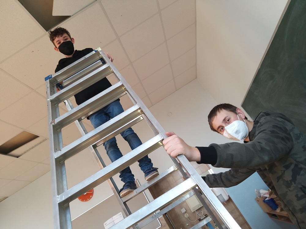 Mehr als sechs Stunden verbrachten Schulwart Peter Ilias und Schulleiter Martin Friedl am Dienstag mit dem Einziehen neuer LAN-Kabel. Zwischenzeitliche Unterstützung bekamen Sie dabei von Tobias Birnbaumer (4b), Michi Rupp (4a) und FL Manfred Bauer-Wolf. Über 200 Meter Kabel wurden dabei vom Server weg über den Keller, durch die Direktion und das Konferenzzimmer in den ersten Stock (Physiksaal & Werkraum) verlegt. Ziel ist es, dass Ende Jänner im gesamten Schulhaus WLAN dann über acht Accesspoints verfügbar ist. Ein Dank geht an die fleißigen Helfer!
