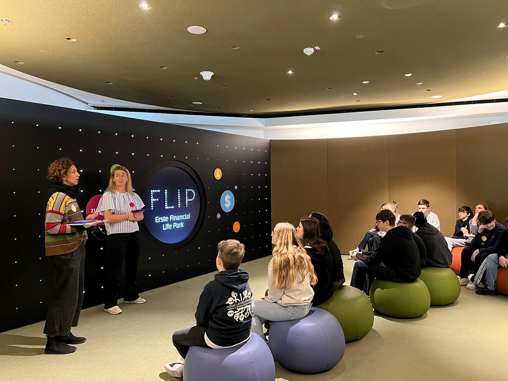 Am Freitag besuchten die 4. Klassen der NMS Lanzenkirchen mit FL Claudia Metz und FL Daniela Michlfeit im Rahmen des GW-Unterrichts eine multimediale Ausstellung im FLIP (Financial Life Parc). In verschiedenen Stationen im Hauptgebäude der Ersten Bank (am Geländes des Hauptbahnhofes Wien) konnten die Schüler*innen ihren Umgang mit Geld überdenken. Vor allem ging es um die Vor- und Nachteile von „Geld sparen“ oder Geld ausgeben“.