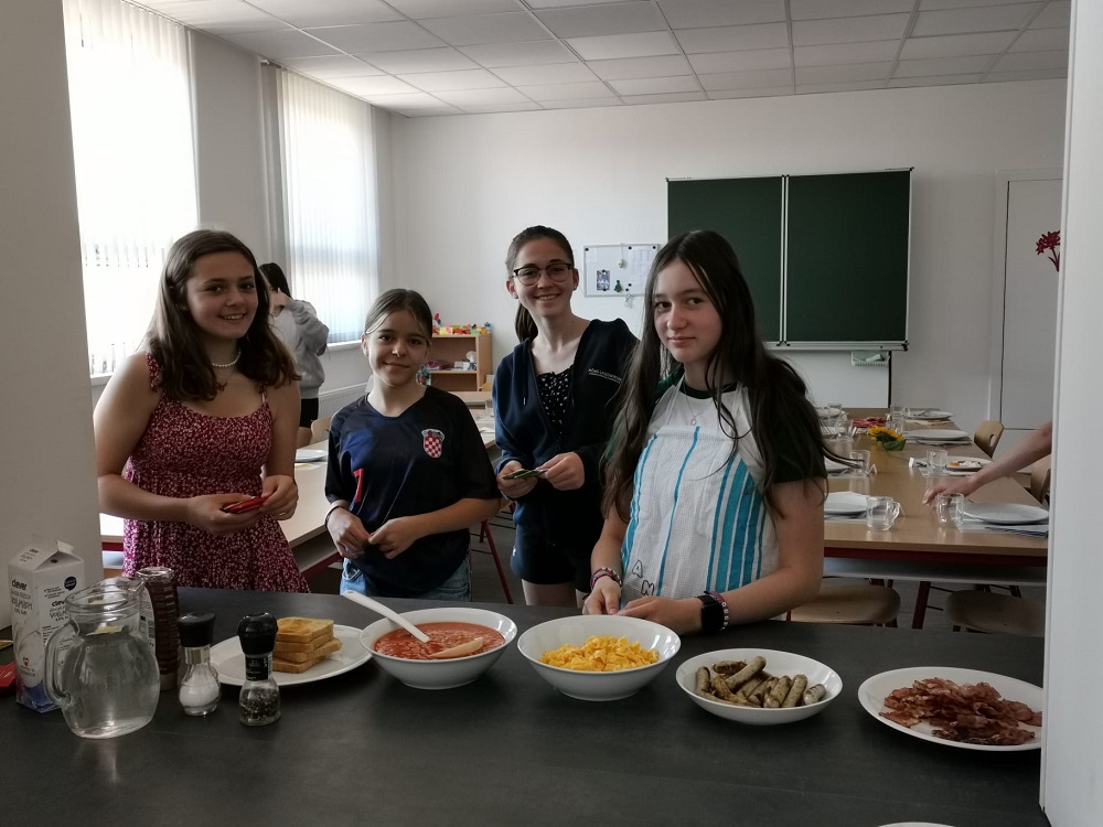 Großes Thema in der 3-Klasse war bei FL Anja Rodler das typisch englische Frühstück. Baked Beans, Ham & Egg und Toast standen ebenso am Menüplan, wie Srambled Eggs, Sausages, Bacon und typischer Breakfast Tea mit Milch. Nachdem gemeinsam gekocht und gegessen wurde, insgesamt nichts für sensible Mägen, schneite auch noch Miss Apple auf einen Kurzbesuch bei ihrer ehemaligen Englisch-Gruppe vorbei.