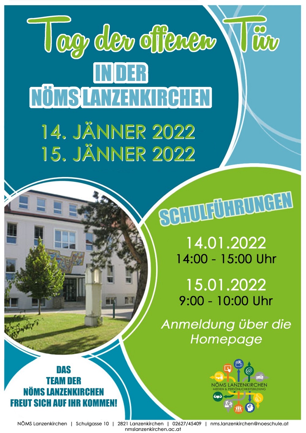 Da die Sicherheitsstufe 3 die Durchführung des „Tages der offenen Tür“ nicht gestattet, haben Sie die Möglichkeit außerhalb der Schulzeit unsere Mittelschule zu besuchen. Schulleiter Martin Friedl steht an beiden Terminen für sämtliche Fragen zur Verfügung und führt Sie persönlich durch das Haus. Bitte beachten Sie die geltenden 2G-Regeln. Die Anmeldung erfolgt über die Homepage (eigenes Online-Formular), für die 2G-Kontrolle bitte den grünen Pass in digitaler oder analoger Form bereit halten.