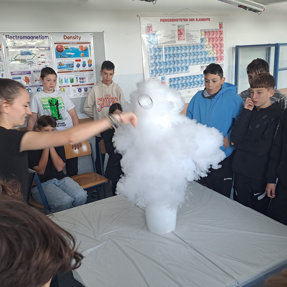 Spannende drei Unterrichtsstunden erlebten die Schüler*innen der 3a und 3b am Mittwoch in Physik. Denn FL Elisabeth Neuhold organisierte mit dem Talente-Campus Hernstein einen Workshop, bei dem zahlreiche Versuche mit Trockeneis durchgeführt wurden. Trockeneis, bis zu Minus 80 Grad kalt, wird nicht nur zum Kühlen vom Lebensmittel, sondern auch für Spezialeffekte auf der Bühne verwendet. In einem Stationenbetrieb wurden Seifenblasen hergestellt, Luftballons aufgeblasen sowie viel Dampf und Rauch erzeugt. Zusätzlich wurden Kometen, die aus Trockeneis, Gesteinen, Sand, Ammoniak und Trockeneis bestehen, selbst geformt.